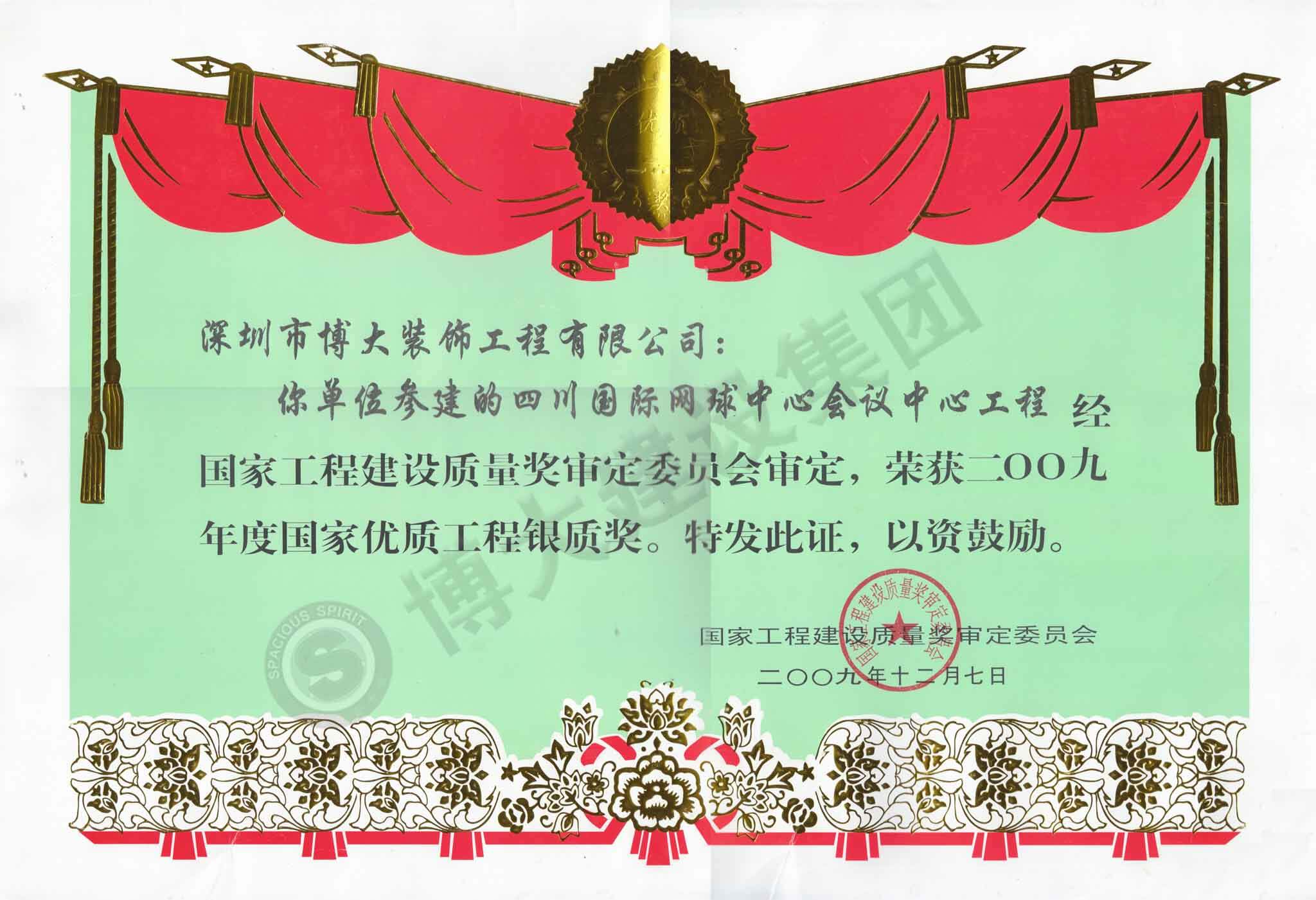 國(guó)家年度優(yōu)質(zhì)工程銀質(zhì)獎(jiǎng)(四川國(guó)際網(wǎng)球中心會(huì)議中心工程)