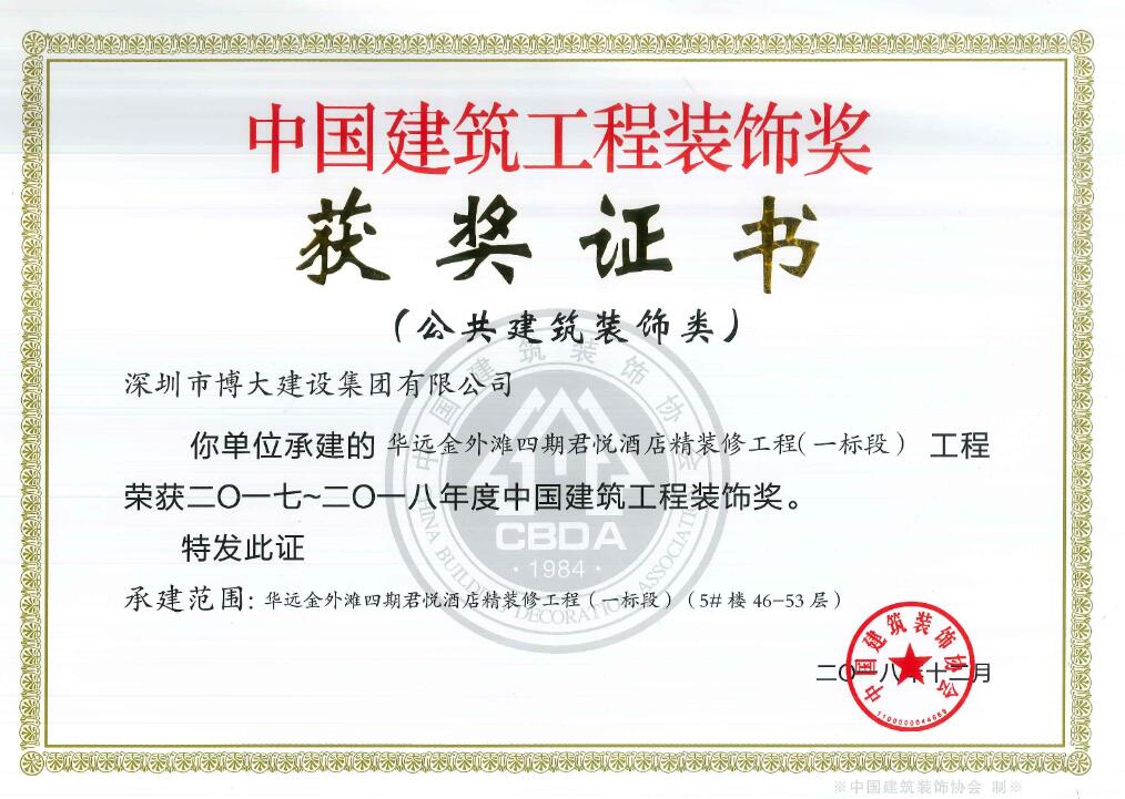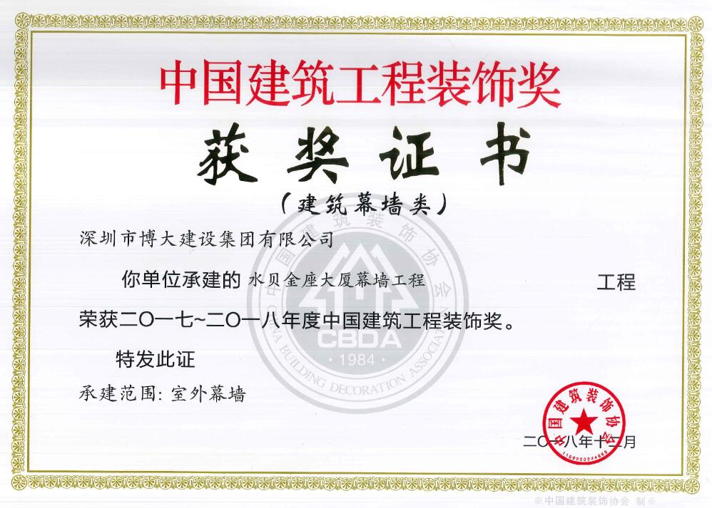 博大建設集團承建的昆明醫科大學第一附屬醫院3號樓、華遠金外灘四期君悅酒店、綠景虹灣裙樓商業公共部分、水貝金座大廈幕墻工程、天健科技大廈幕墻工程等5個經典工程以卓越品質榮獲中國建筑工程裝飾獎。
