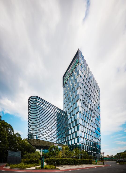 幕墻安裝形式主要為構架式,一層為全玻幕墻和鋁板幕墻,二層有玻璃雨棚,二層以上為橫明豎隱玻璃幕墻。博大使用了最新技術——彈簧銷固定橫梁系統,安裝效率提升三分之一;節能方面——在外墻玻璃上使用了雙銀LOW-E玻璃,層間使用50mm厚保溫巖棉,采用自然通風設計,最大限度節約能源;環保方面——綠化率高達30%以上,裙樓屋頂大面積綠化。