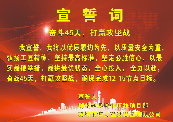 “我將以優(yōu)質(zhì)履約為先,以質(zhì)量安全為重;弘揚(yáng)工匠精神,堅(jiān)持最高標(biāo)準(zhǔn),堅(jiān)定必勝信心;以最實(shí)最硬舉措、最拼最優(yōu)狀態(tài);全力投入、全力以赴;奮戰(zhàn)45天,打贏攻堅(jiān)戰(zhàn),確保完成12.15節(jié)點(diǎn)目標(biāo)!”