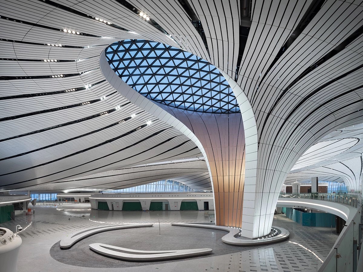 北京大興國際機場航站樓形如展翅的鳳凰,五指廊的造型完全以旅客為中心。整個航站樓有82個登機口,但是旅客從航站樓中心步行到達任何一個登機口,所需的時間不超過8分鐘。博大建設集團承建了中南指廊國際出發到達區域室內裝飾工程。